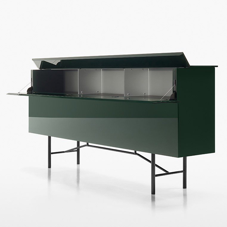 Con Grand Buffet de Massimo Castagna, Acerbis reinterpreta el clásico aparador y le otorga elegancia y practicidad, añadiendo luces LED y facilitando la accesibilidad a la parte trasera de los compartimentos. Dividido horizontalmente en dos espacios, el compartimento superior adopta el innovador sistema de apertura Dual-Flap® patentado por Acerbis: con un toque, el panel frontal se inclina 90 grados, mientras que una parte de la tapa se levanta para facilitar el acceso.