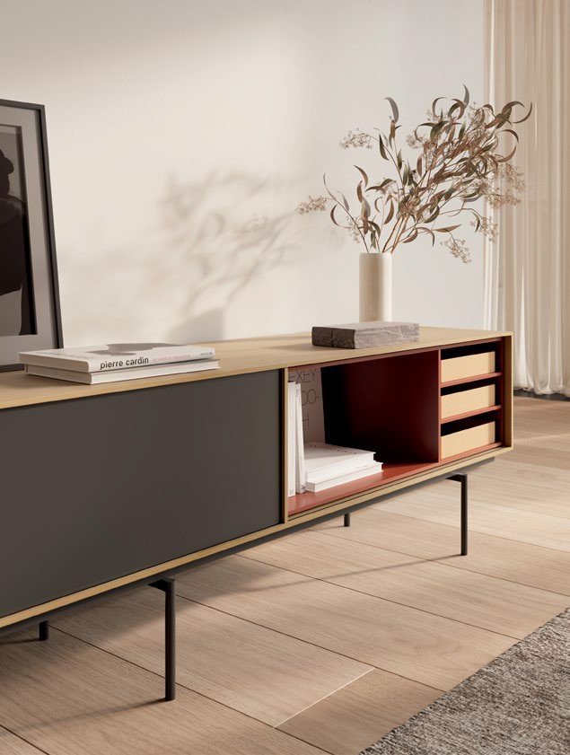 Ángel Martí y Enrique Delamo han diseñado la colección Aura para la firma Treku, una versátil y funcional familia de contenedores pensada para la zona de estar o el comedor del hogar. Su estructura modular permite distintas combinaciones y medidas, y la aplicación opcional de cierres con tapa de diversos colores refuerza el uso práctico de los módulos. El diseño de la colección permite combinar los dos tipos de madera con los diferentes acabados cromáticos, así como los lacados entre sí. El conjunto se complementa con unos soportes metálicos que le otorgan ligereza y solidez.
