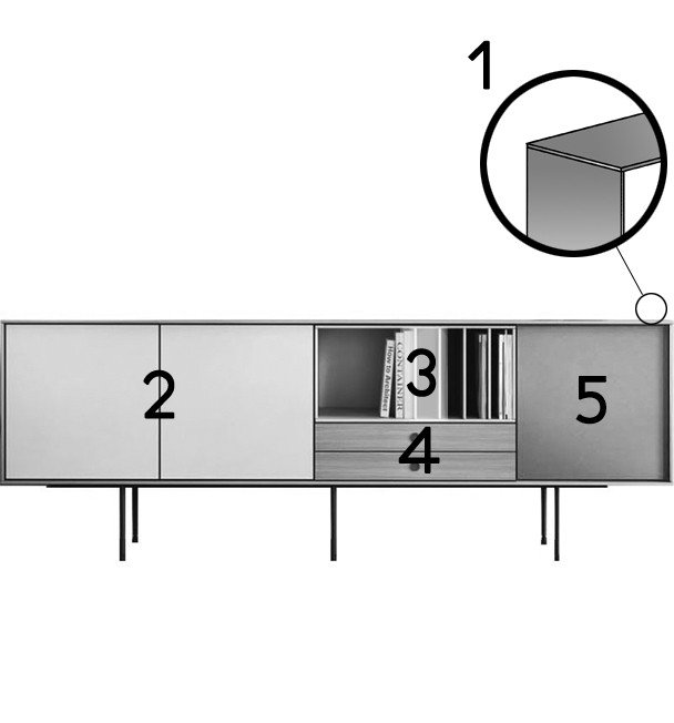 – Módulos lacados: tablero aglomerado recubierto de DM. Barnizado con fondo UV y laca acrílica.