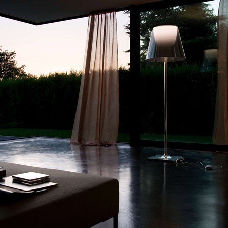 Lámpara de pie que proporciona una iluminación difusa; un interruptor situado cerca del difusor permite el ajuste de la luz en 4 niveles mediante un “regulador remoto situado en el cable de alimentación cerca del enchufe”. Base, asta y soporte del difusor en aleación de zamak brillante y cromado, fundida a presión. Tapa de la base de chapa de acero P04 galvanizada. Difusor interior y soporte portalámparas realizados en inyección de PC (policarbonato) de color opalino. Los difusores exteriores están disponibles en transparente o fumè realizados en PMMA (polimetilmetacrilato) y en metalizado bronce en la superficie interior utilizando un proceso de aluminizado en vacío. Anillo superior realizado en inyección de PC (policarbonato) totalmente transparente o transparente marrón para la versión con difusor exterior metalizado bronce. El dimmer electrónico que está en el cable consiente la regulación gradual de la intensidad luminosa.